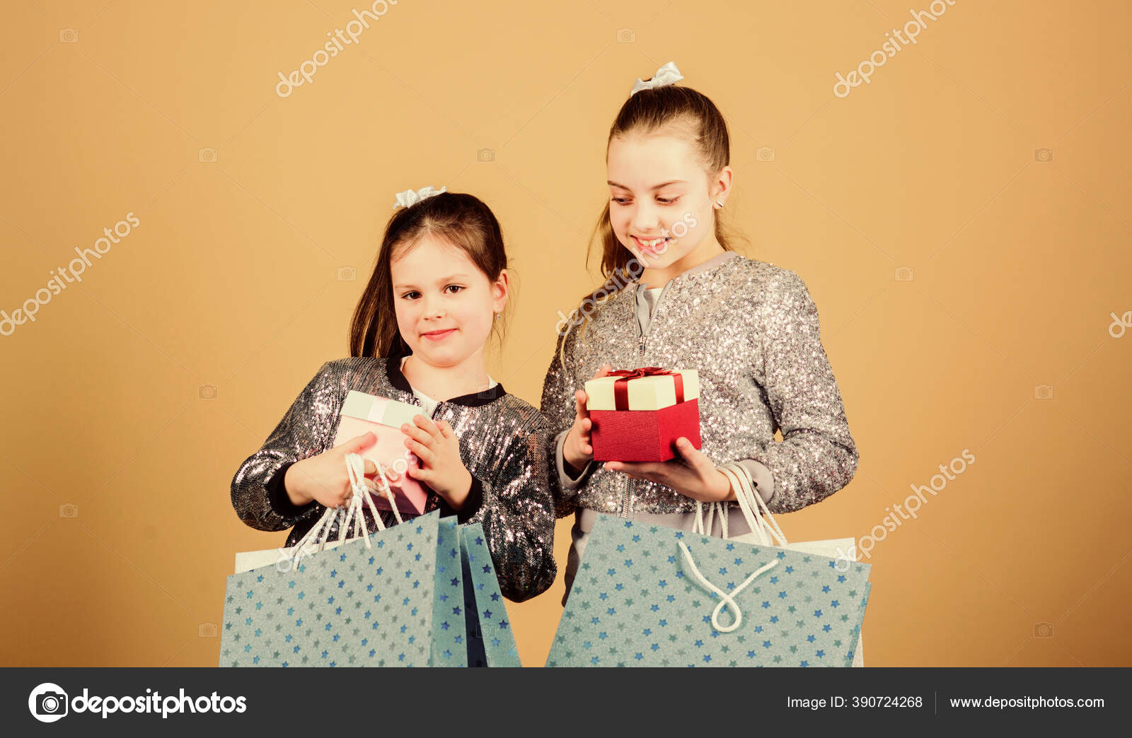 Anak yang bahagia. Adik perempuan dengan kotak hadiah. Penjualan dan diskon. Persaudaraan dan keluarga. menabung pada