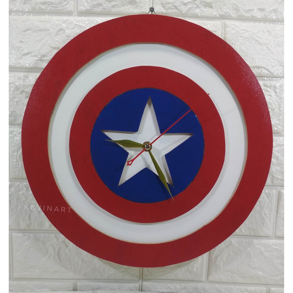 JAM DINDING KAYU 3D UNIK MURAH UKIRAN KARAKTER BESAR CUSTOM ARTISTIK GAMBAR LOGO CAPTAIN AMERIKA | Shopee Indonesia