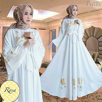 gamis wanita putih polos sablon bunga mawar emas lengan terompet tali pinggang hitam dusty pink | Shopee Indonesia