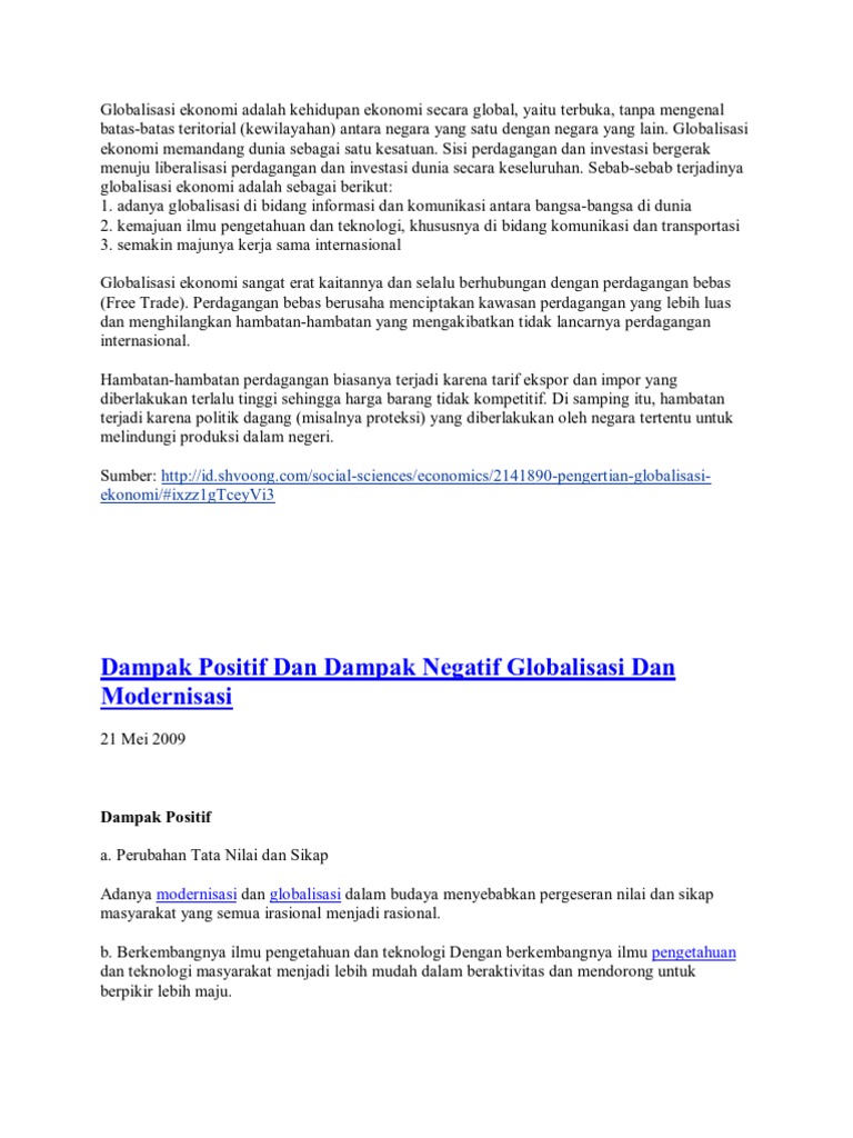 Dampak Positif dan Negatif Globalisasi Ekonomi dan Sosial Budaya