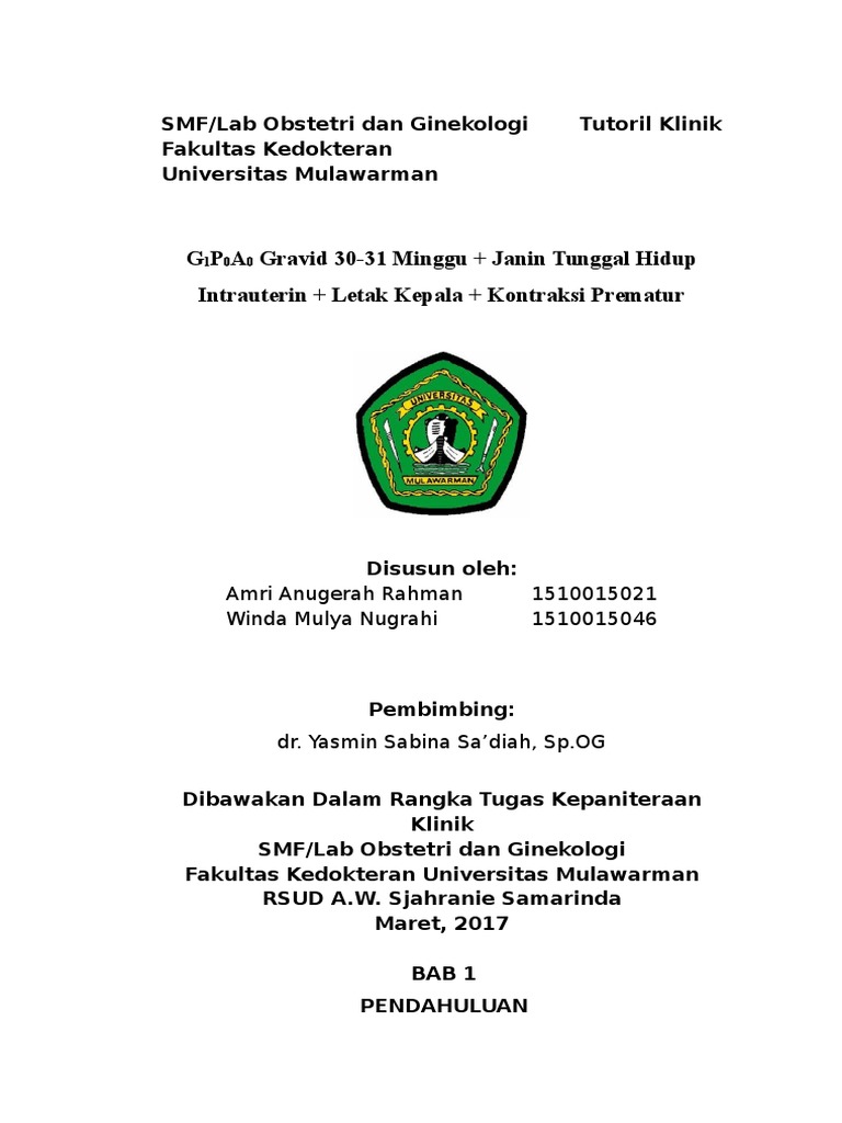 DOC) Laporan Kasus G5P3A1 HAMIL 31 MINGGU BELUM INPARTU DENGAN PARTUS PREMATURUS IMMINENS JANIN TUNGGAL HIDUP PRESENTASI KEPALA + HIV | Tessa Hijriani - Academia.edu