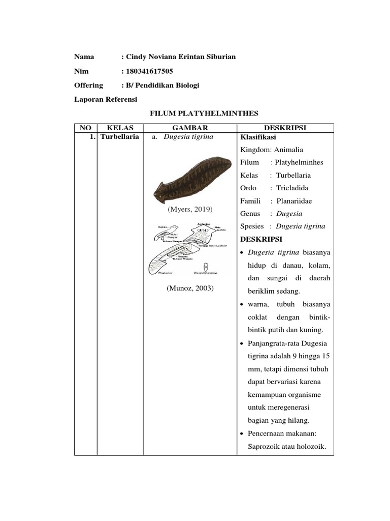 Nama: Cindy Noviana Erintan Siburian Nim: 180341617505 Offering: B/ Pendidikan Biologi Laporan Referensi Filum Platyhelminthes NO Kelas Gambar Deskripsi 1. Turbellaria Klasifikasi