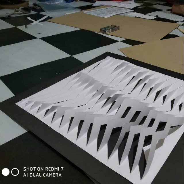nirmana 3 dimensi, dibuat menggunakan stiker warna putih, hitam dan abu-abu Agung Rangga