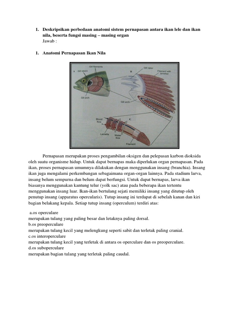 1. Deskripsikan perbedaan anatomi sistem pernapasan antara ikan lele dan ikan nila, beserta fungsi masing – masing organ