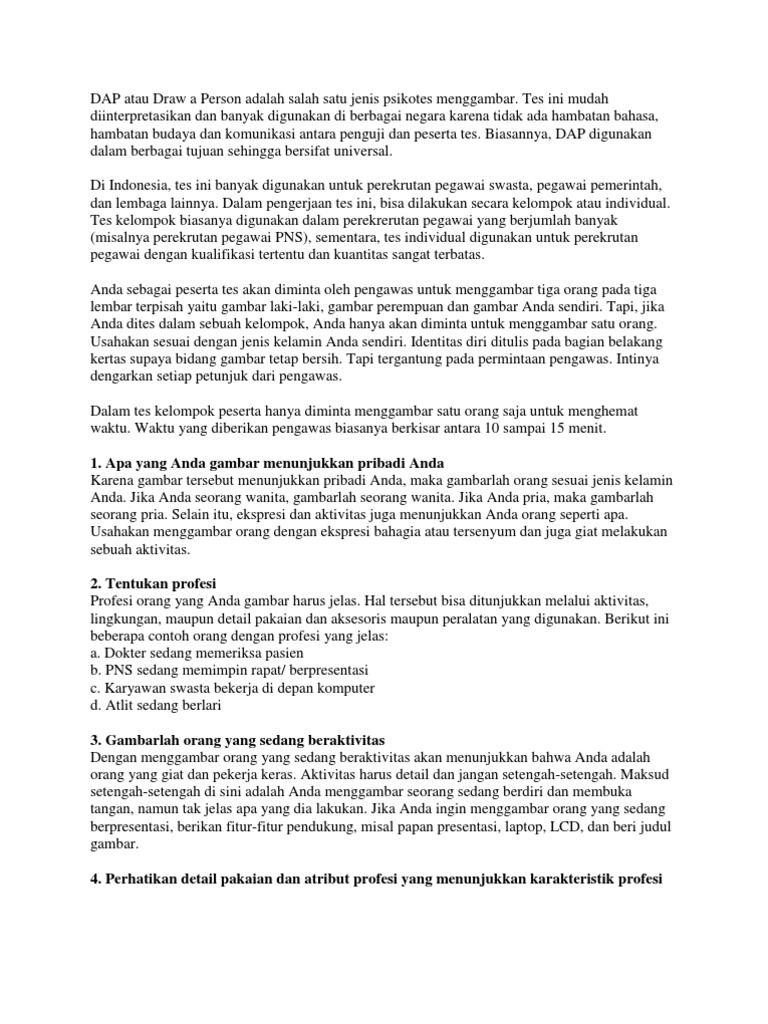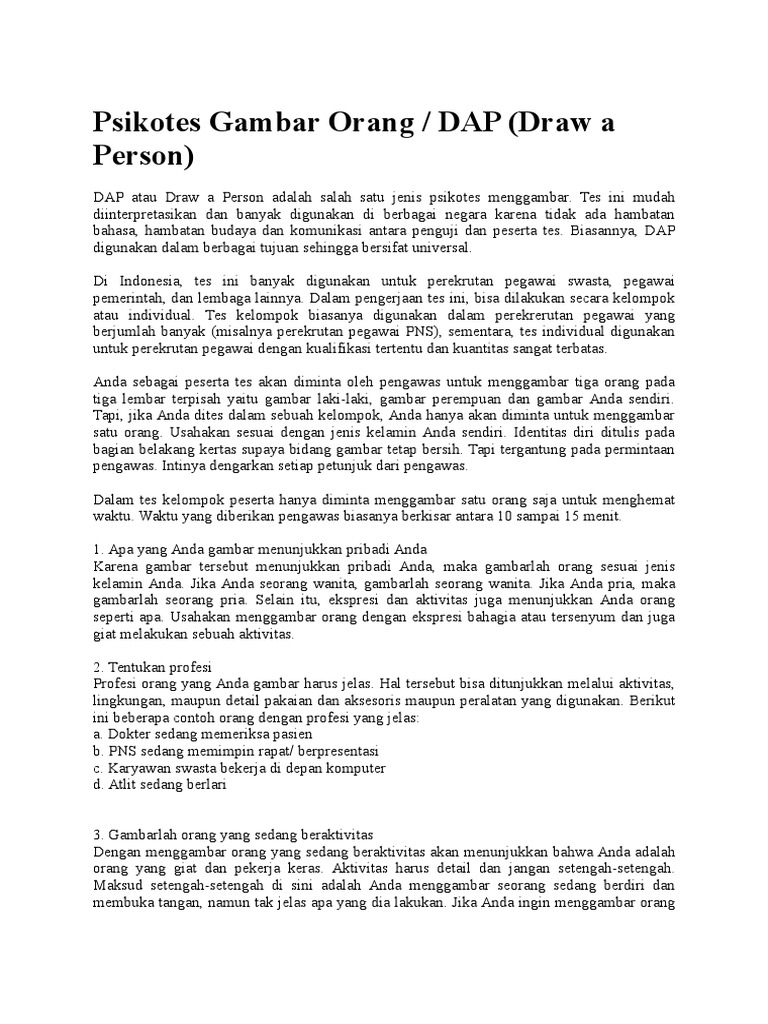 Facebook Pro~kontrA - Psikotes Gambar Orang / DAP (Draw a Person) DAP atau Draw a Person adalah salah satu jenis psikotes menggambar. Tes ini mudah diinterpretasikan dan banyak digunakan di berbagai negara