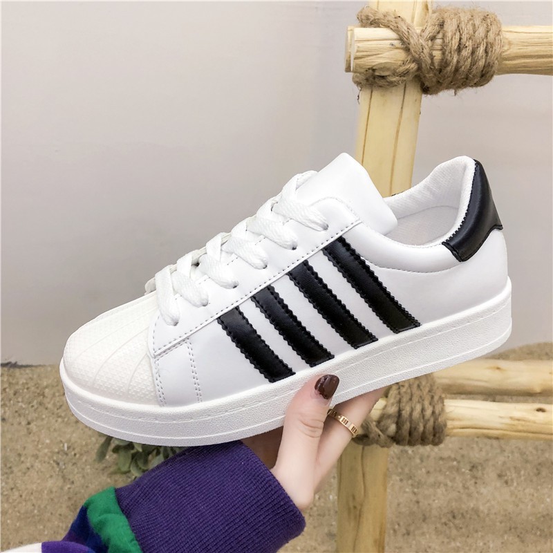 Sepatu Sneakers Wanita Model Shell Head Simple Motif Garis Warna Hitam Putih | Shopee Indonesia