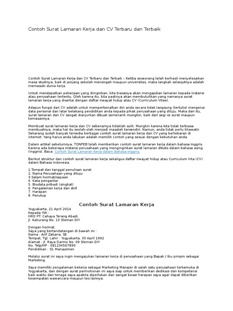 Contoh Surat Lamaran Kerja Dan CV Terbaru Dan Terbaik