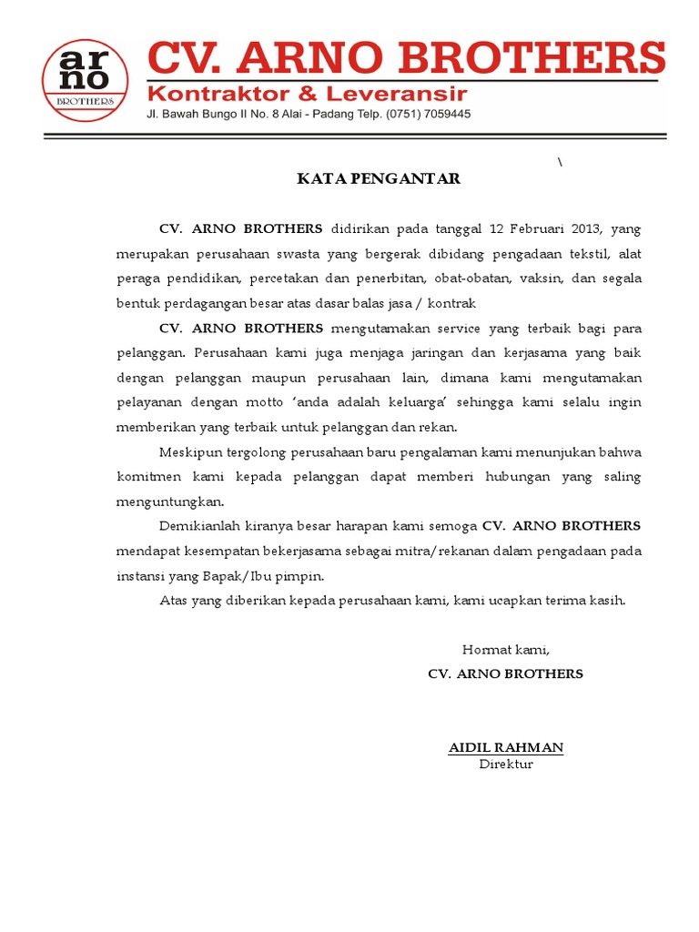 Kata Pengantar: CV. ARNO BROTHERS didirikan pada tanggal 12 Februari 2013, yang