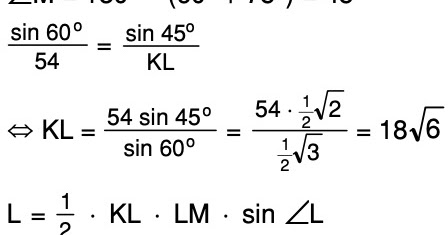 Hitunglah luas segitiga KLM jika LM = 54 cm, K = 60° dan L = 75°! - Mas Dayat