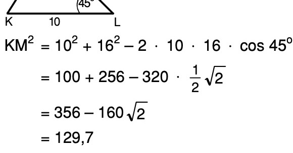 Diketahui segitiga KLM dengan KL = 10 cm, LM = 16 cm, dan L = 45°. Panjang sisi KM = - Mas Dayat