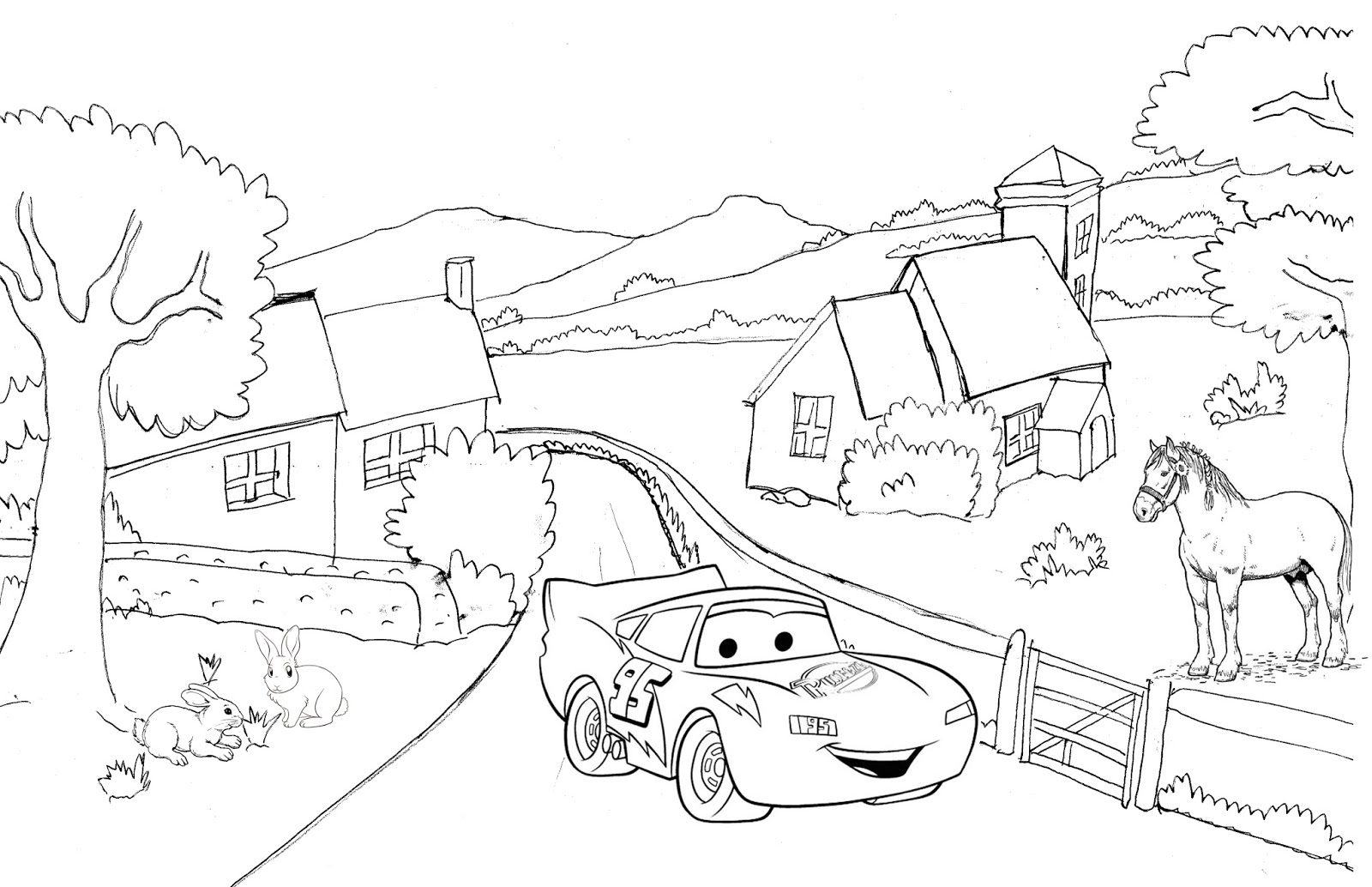 Gambar Untuk Mewarnai Pemandangan Berlatar Sawah Pohon Gunung Dan Hewan Sapi Anjing Ikan BELAJARMEWARNAI.info