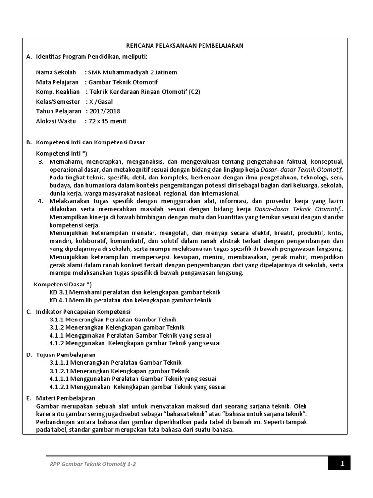 RPP Gambar Teknik Otomotif 3.1-4.1_Pertemuan 1-2 Ganjil.docx - RENCANA PELAKSANAAN PEMBELAJARAN A Identitas Program Pendidikan meliputi Nama Sekolah | Course Hero