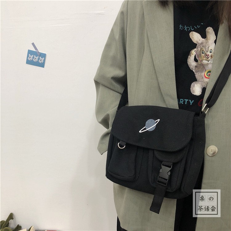 Vova | Japan dark black wind planet diagonal bag Korea ins literary tooling Hong Kong style canvas bag men nd women Harajuku postman bag