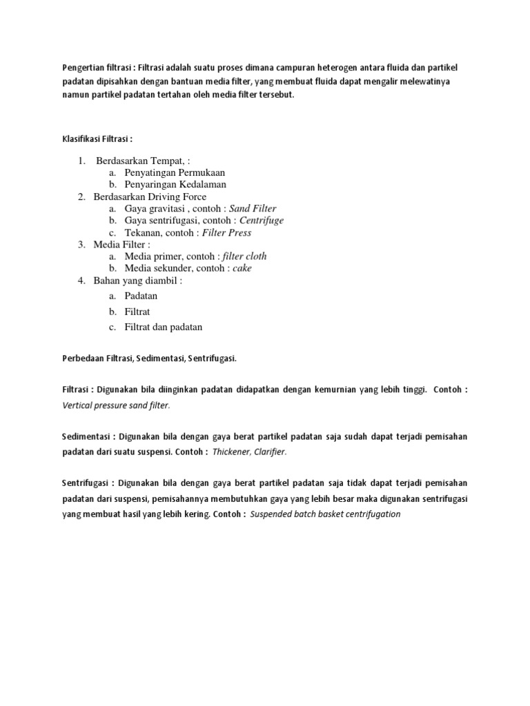 Filtrasi,Sedimentasi.ppt - PEMISAHAN SECARA MEKANIS Campuran padat-cair sering disebut dengan suspensi(suspension atau slurry Ada beberapa tujuan yang | Course Hero