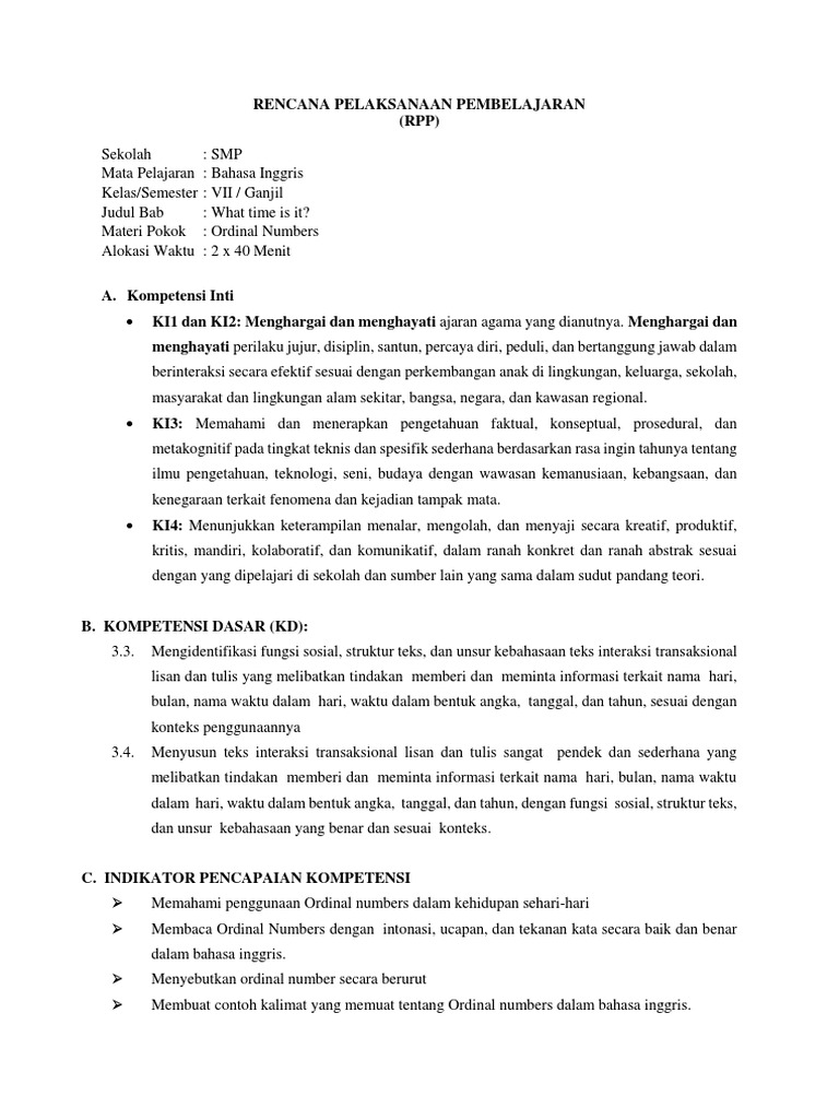 Peer Teaching 1 RPP Grade 7 Chapter 3 Ordinal Numbers- Uky