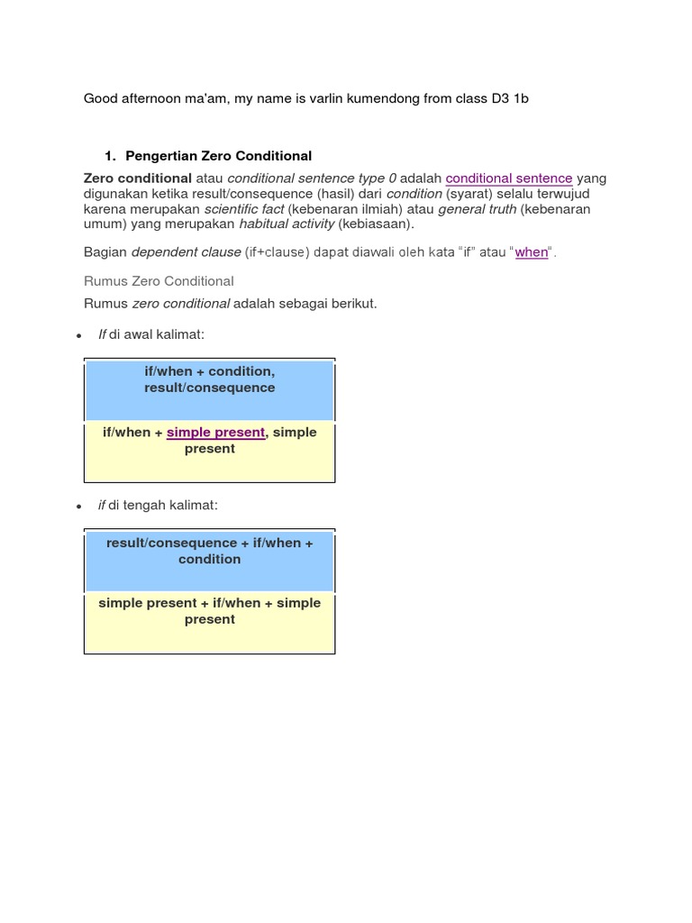 1. Pengertian Zero Conditional: Good afternoon ma’am, my name is varlin kumendong from class D3 1b