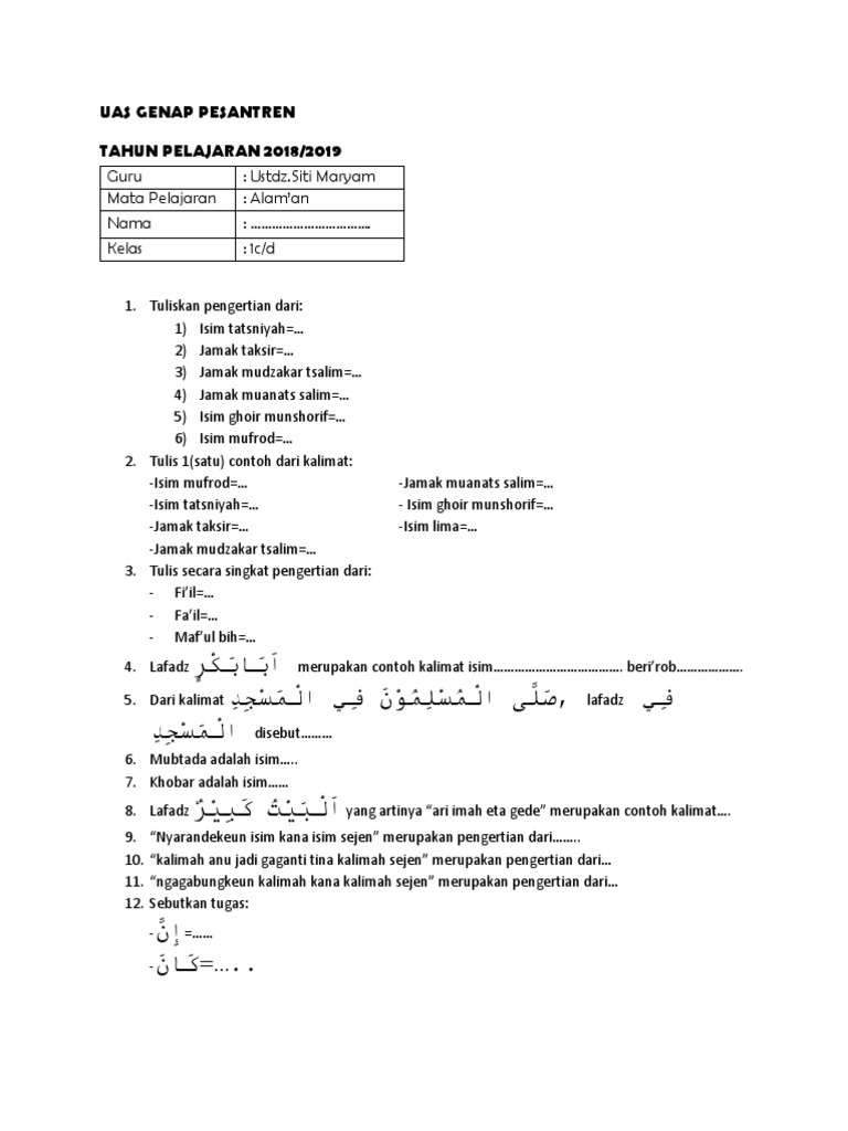 Guru: Ustdz.Siti Maryam Mata Pelajaran: Alam’an Nama: ……………………………. Kelas: 1c/d