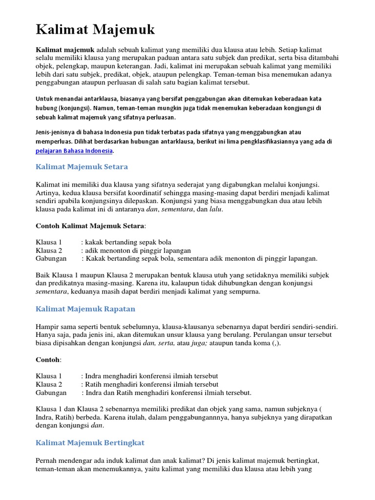 Kalimat Majemuk - Pengertian & Contoh Setara Bertingkat Campuran