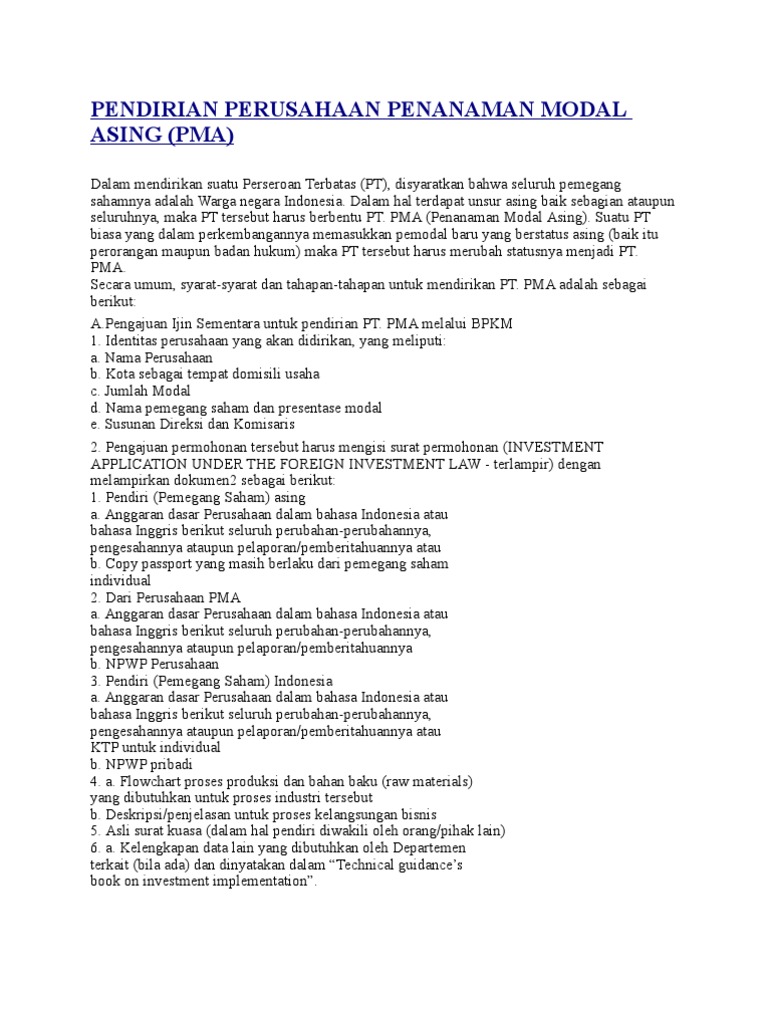 PROSES DAN SYARAT PENDIRIAN PT PENANAMAN MODAL ASING – Bakuning Hyang Mrih Guna Santyaya Bhakti