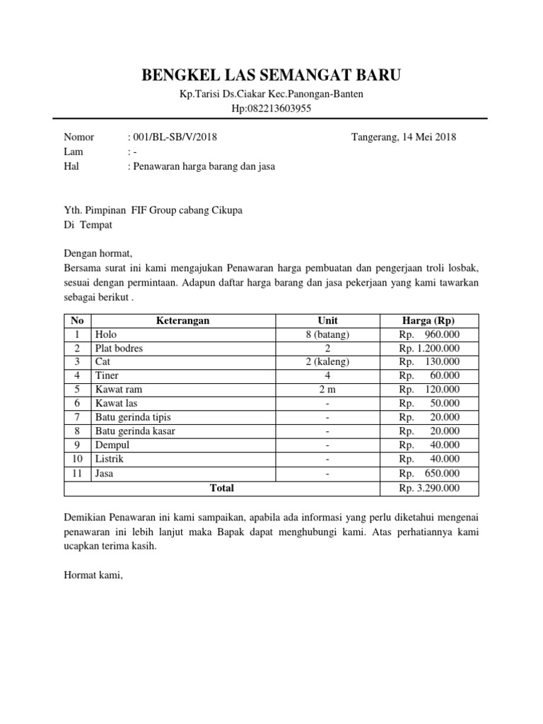 Contoh Surat Penawaran Harga Bengkel Las | Surat, Pengikut