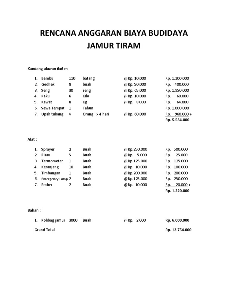 Rencana Anggaran Biaya Budidaya Jamur Tiram