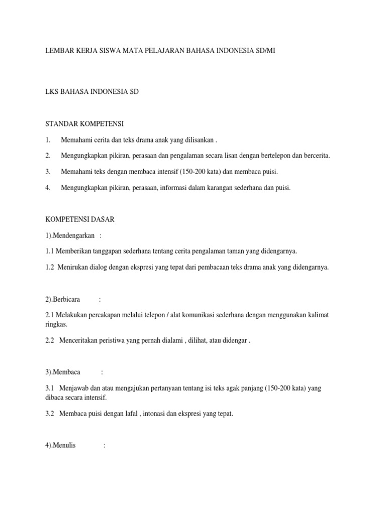 Lembar Kerja Siswa Mata Pelajaran Bahasa Indonesia Sd
