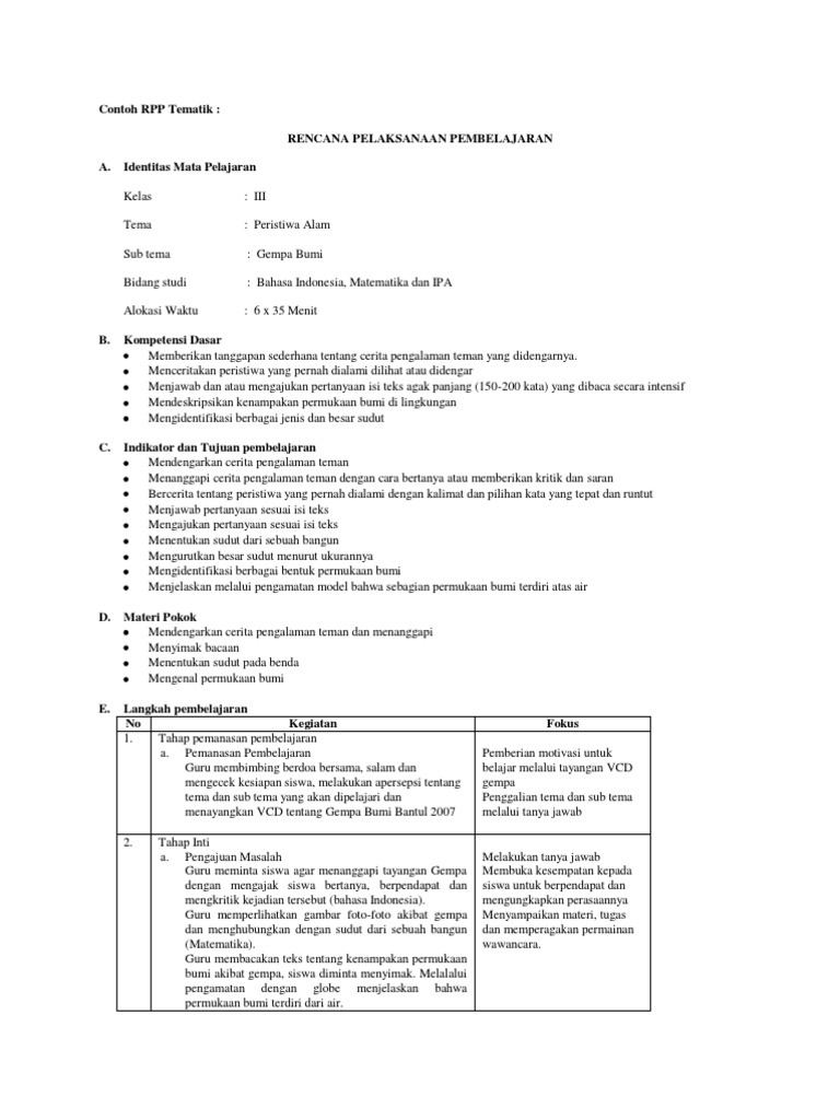 Contoh RPP Tematik Di SD Kelas Rendah