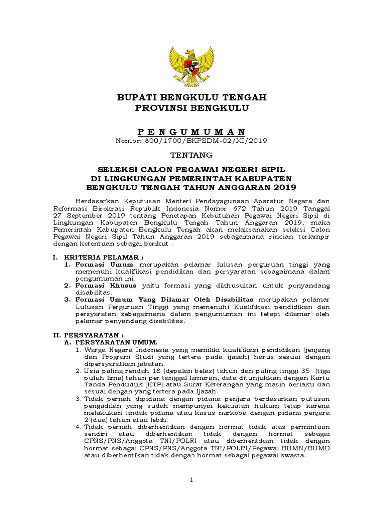 Pengumuman Seleksi CPNS Kabupaten Bengkulu Utara Formasi Tahun Anggaran 2019
