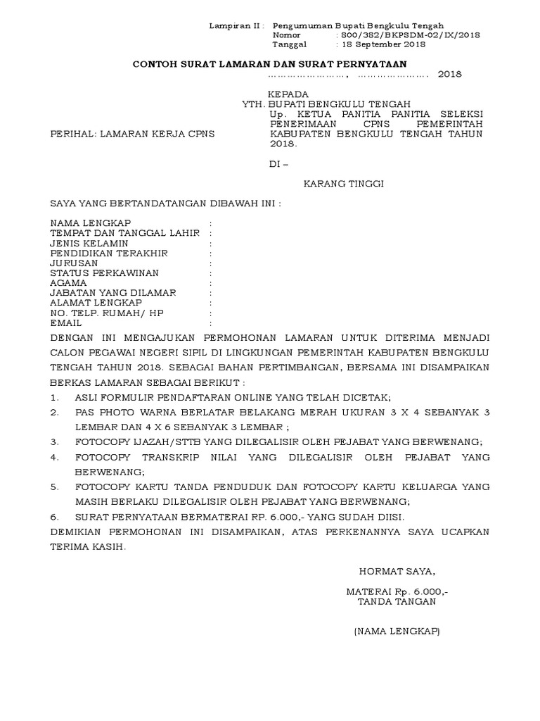 Download Contoh Surat Lamaran dan Pernyataan Seleksi CPNS 2019 PROVINSI KABUPATEN KOTA PDF Word