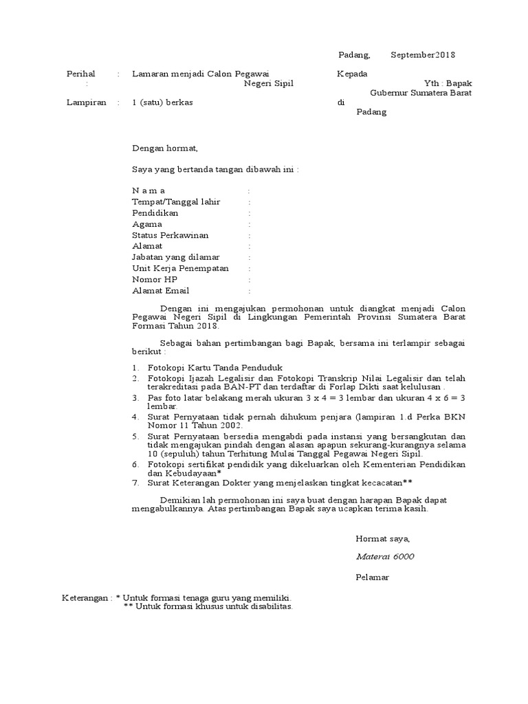 Contoh Surat Lamaran Cpns Pemprov Sumbar 2018 - Berbagi Contoh Surat