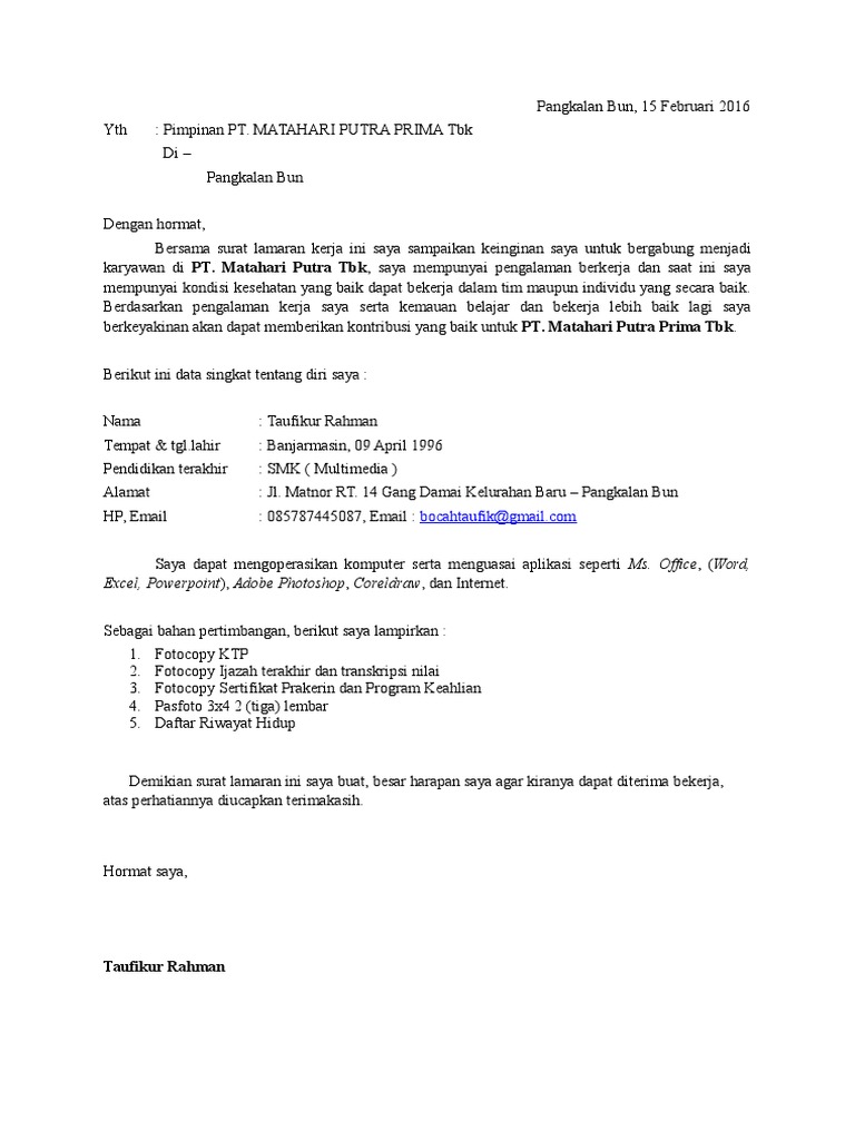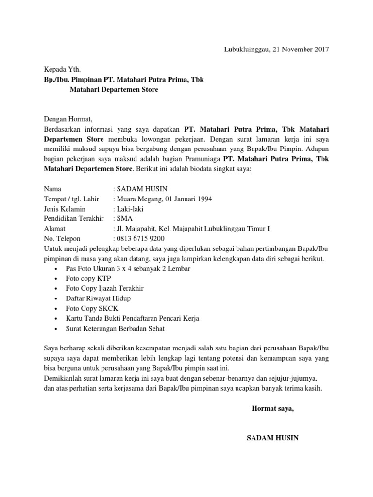 contoh surat lamaran kerja pt matahari department store - Gawe CV