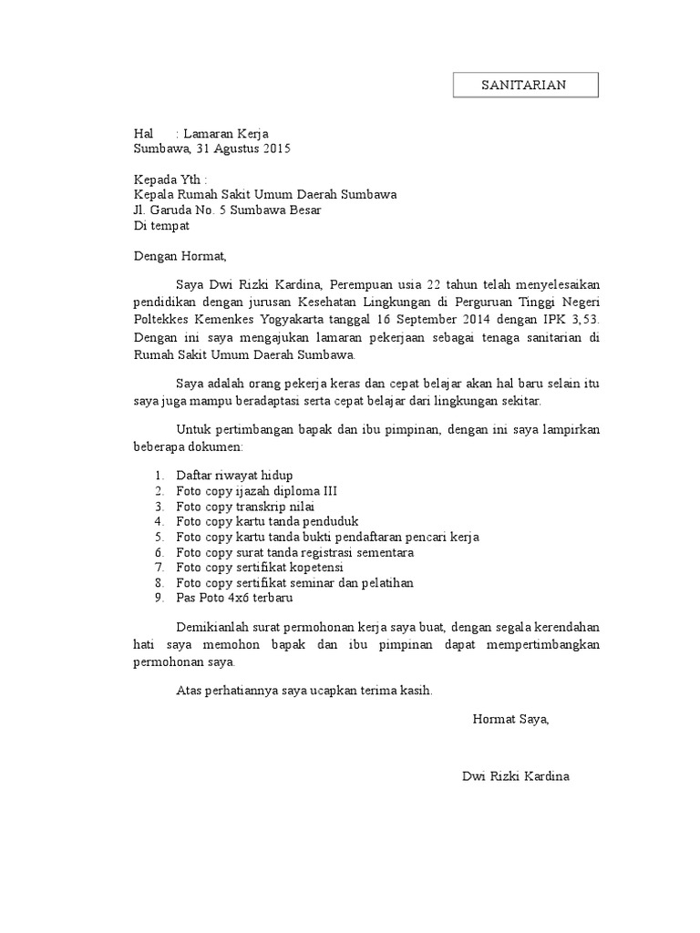 Contoh Surat Lamaran Kerja Di Rs Swasta