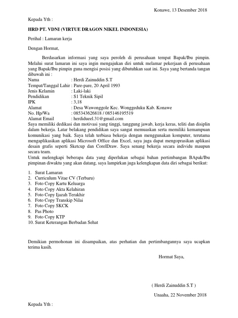 Contoh Surat Lamaran Kerja Di Pt Imip Morowali - Dapatkan Contoh