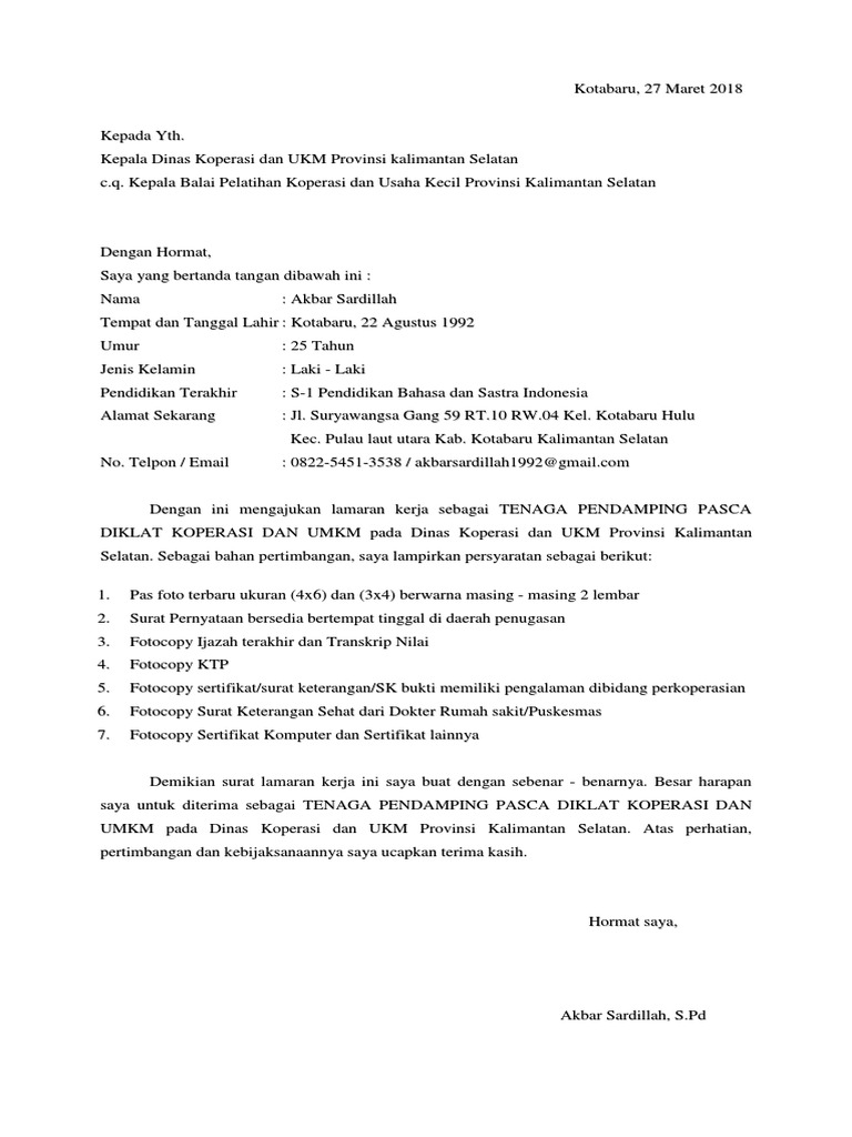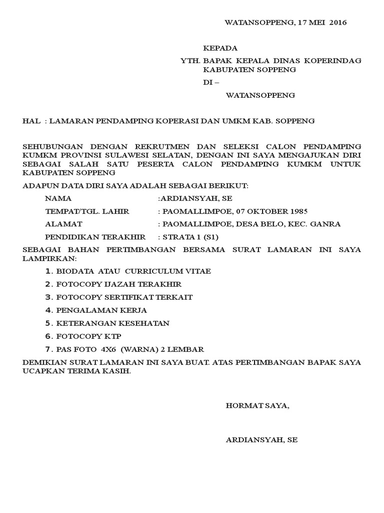 contoh surat lamaran kerja dinas koperasi dan ukm - Gawe CV