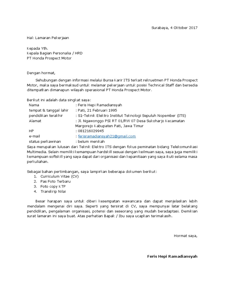 Contoh Surat Lamaran Kerja Di Pt Honda Prospect Motor