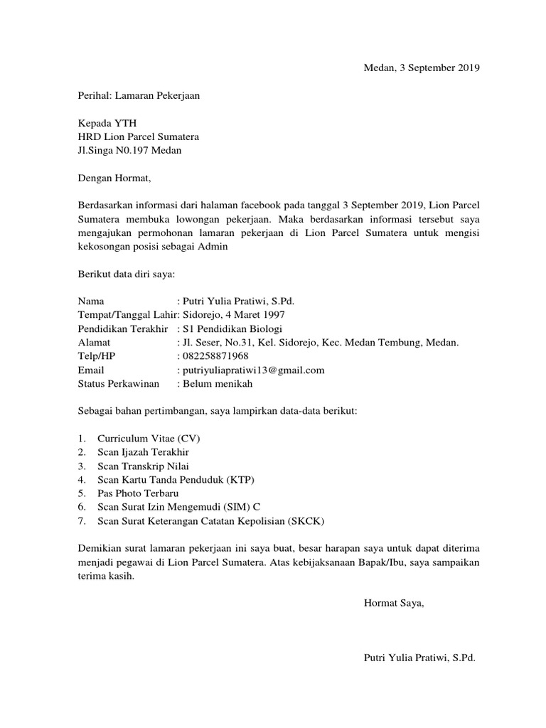 Surat Lamaran Lion Parcel