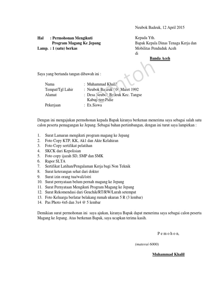 Contoh Surat Lamaran Magang ke Jepang dari Disnakertrans