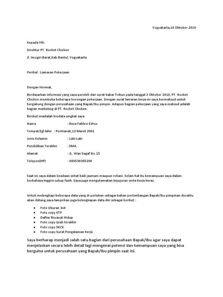 Contoh Surat Lamaran Kerja Pt Rocket Chicken - Contoh Surat Lamaran Kerja