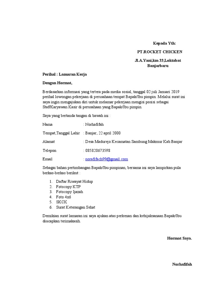 Kepada Yth: Pt.Rocket Chicken Jl.A.Yani,km 33,Loktabat Banjarbaru Perihal: Lamaran Kerja Dengan Hormat,