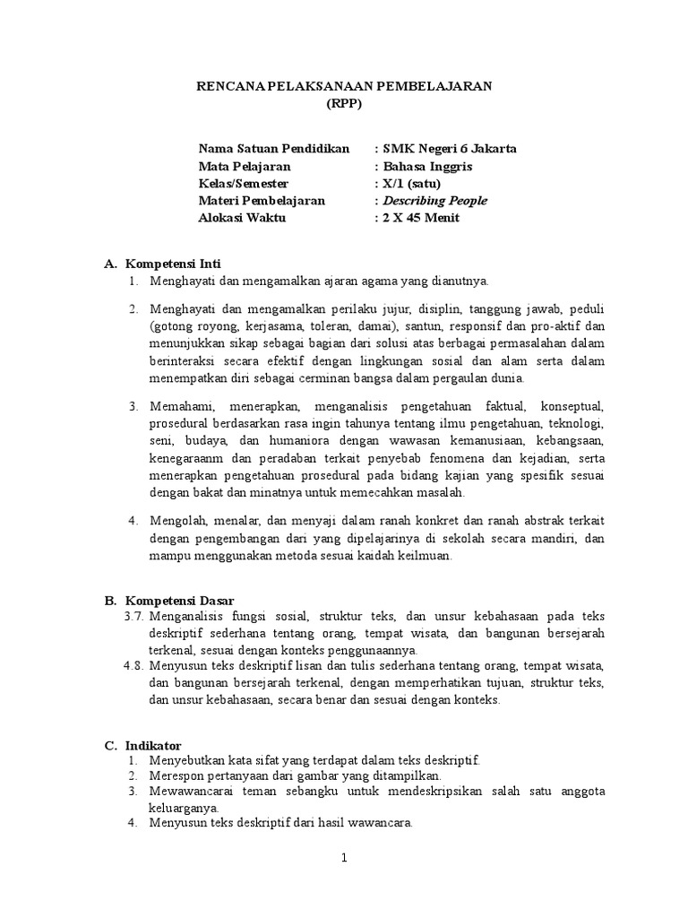 Rpp Bahasa inggris SMK kelas X describing people