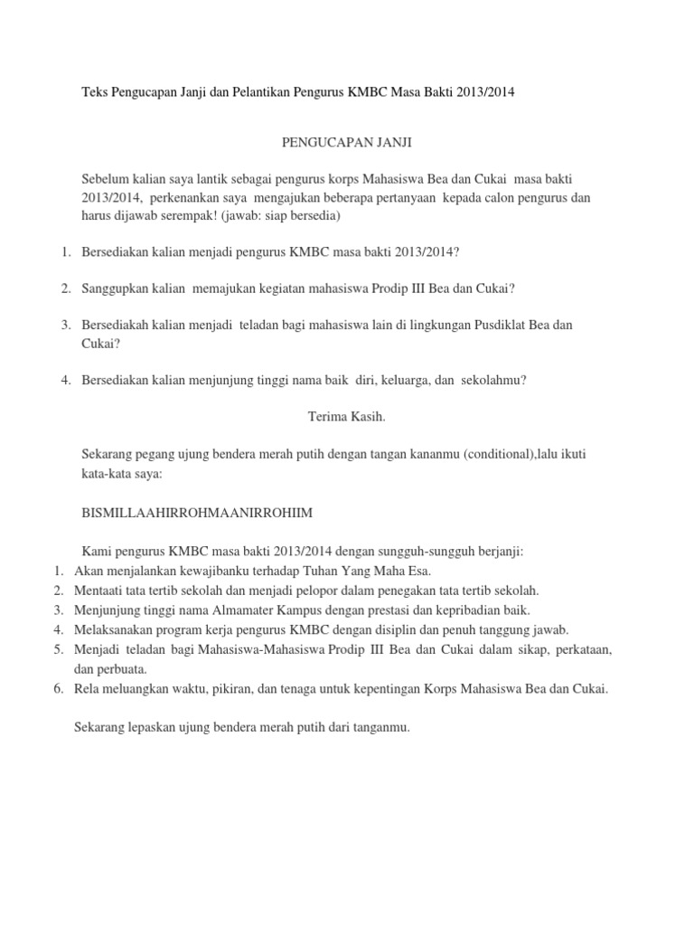 DOC) TEKS PENGUCAPAN JANJI DAN PRAKATAPELANTIKAN PENGURUS OSIS MASA BAKTI 2014 | Kaka Selenge’an - Academia.edu