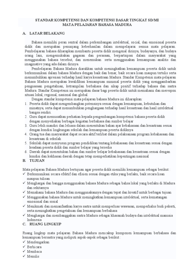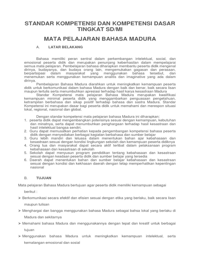 Standar Kompetensi Dan Kompetensi Dasar Tingkat Sd Bahasa Madura