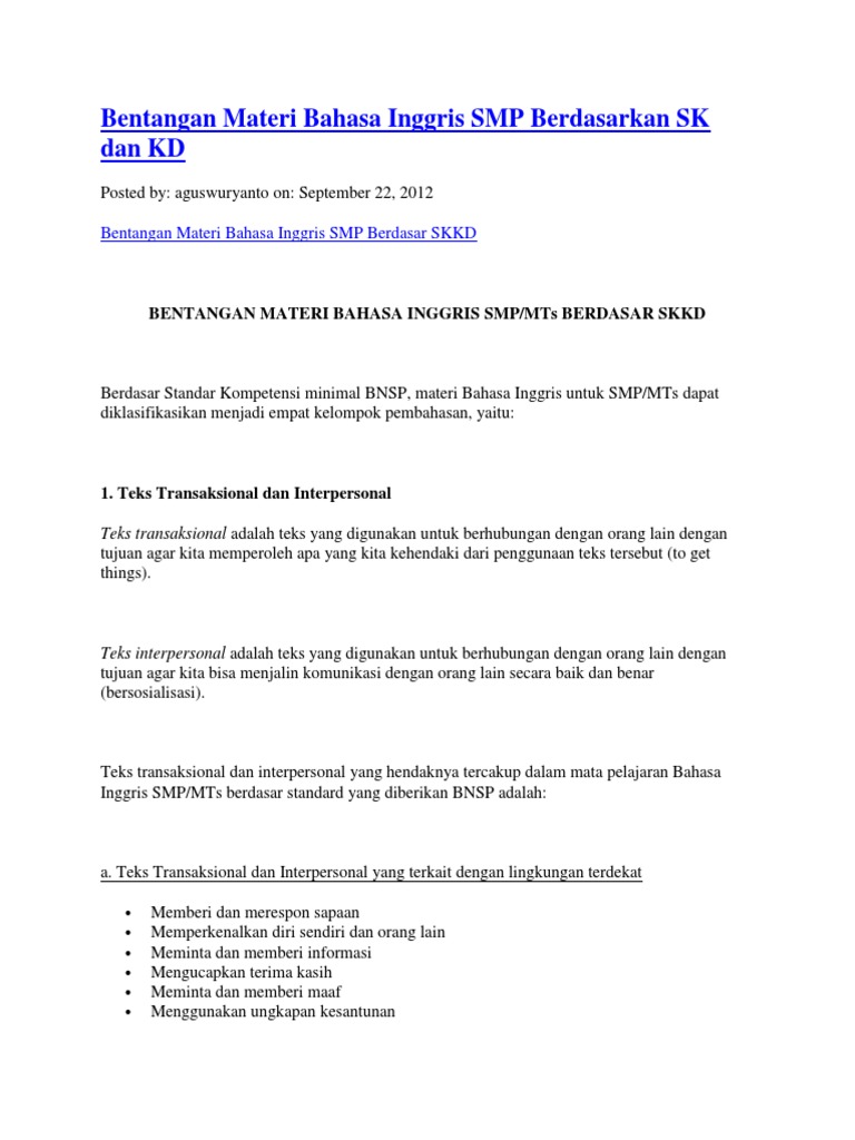 DOC) BENTANGAN MATERI BAHASA INGGRIS SMP/MTs BERDASAR SKKD | Hanna Fload - Academia.edu