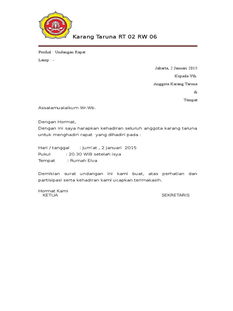 Contoh Surat Undangan Rapat Karang Taruna Sederhana