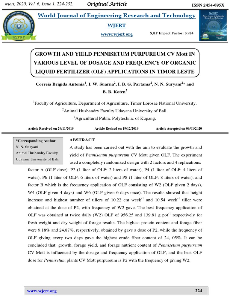 GROWTH AND YIELD PENNISETUM PURPUREUM CV Mott IN VARIOUS LEVEL OF DOSAGE AND FREQUENCY OF ORGANIC LIQUID FERTILIZER (OLF) APPLICATIONS IN TIMOR LESTE | Fertilizer | Soil
