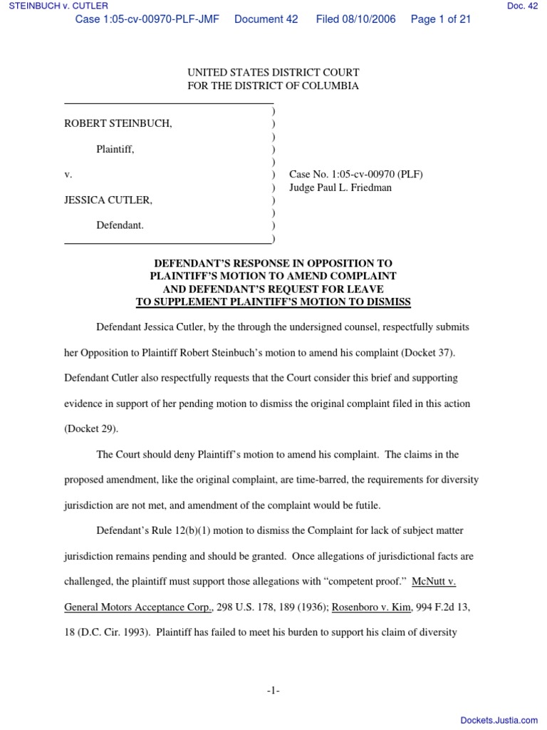 STEINBUCH v. CUTLER - Document No. 42 | Amount In Controversy | Complaint