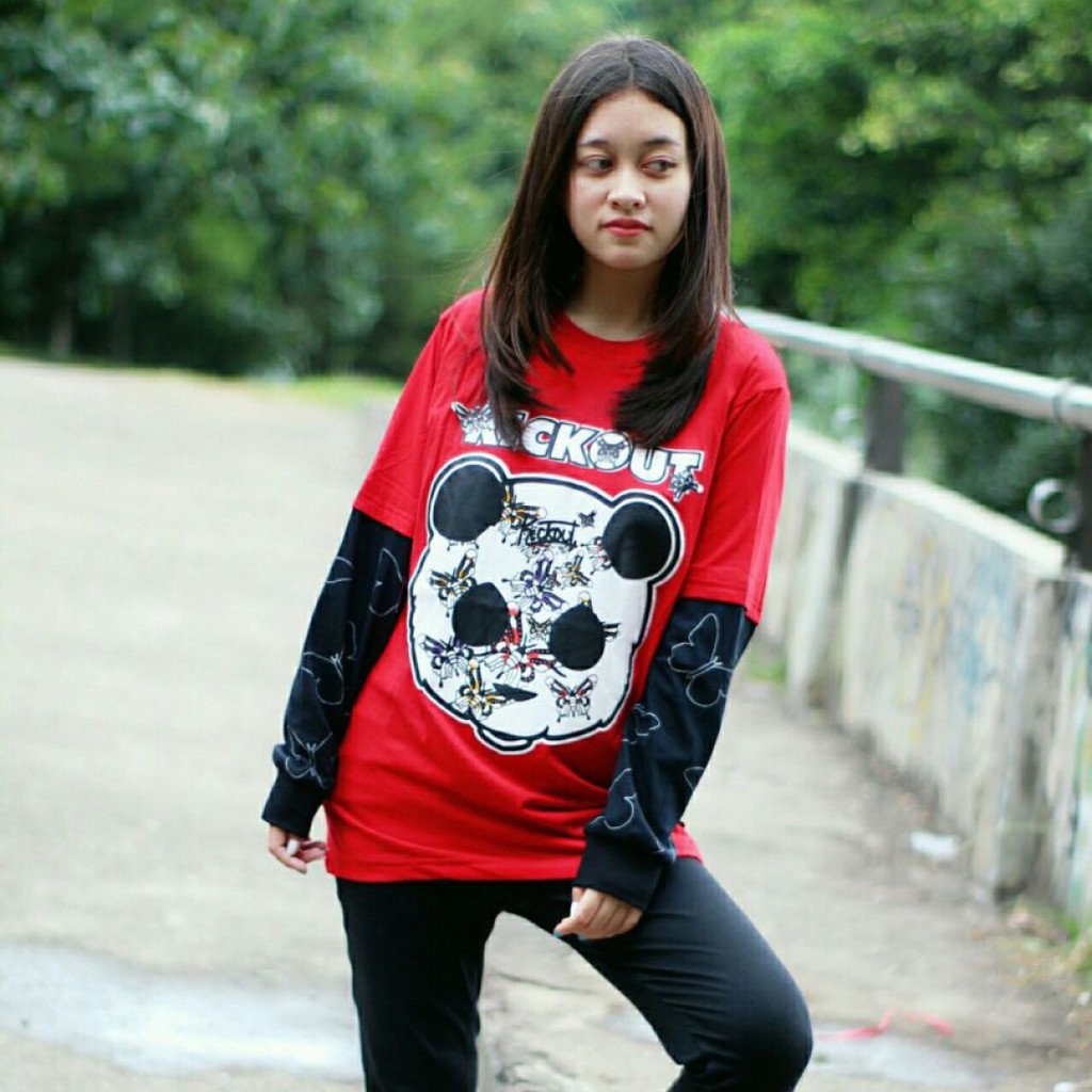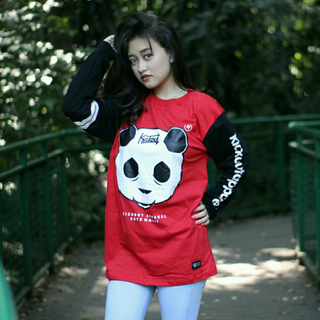 Kaos Distro Kickout Panda Merah Hitam/ Kaos Panjang Wanita Casual | Shopee Indonesia