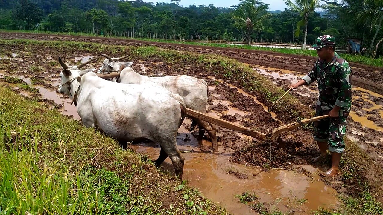 Babinsa di Pamekasan Bantu Petani Bajak Sawah Secara Tradisional