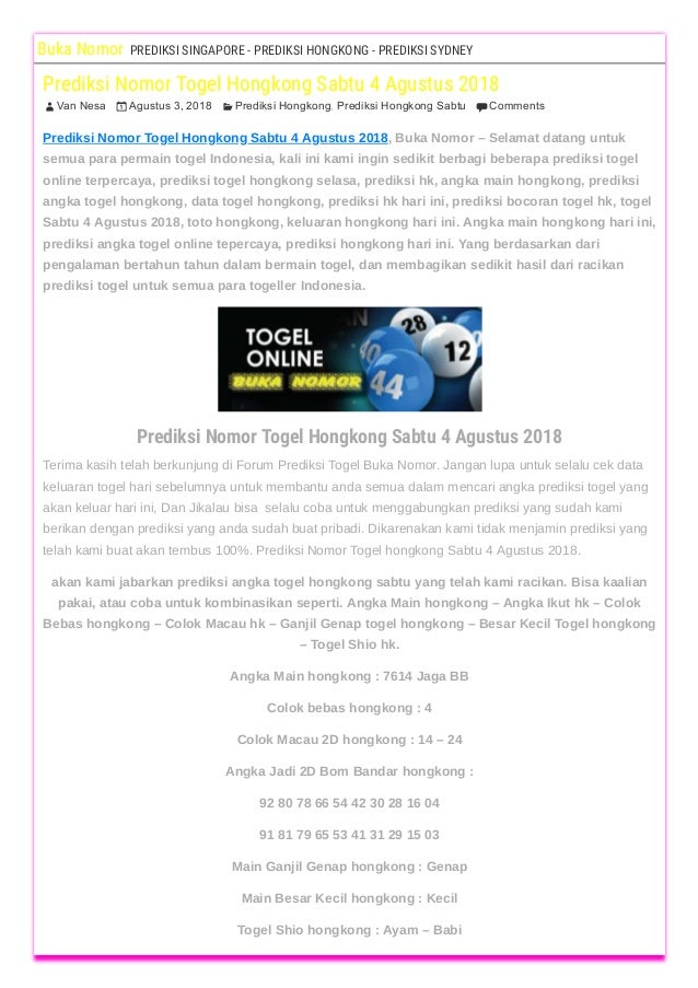 Prediksi nomor togel hongkong sabtu 4 agustus 2018
