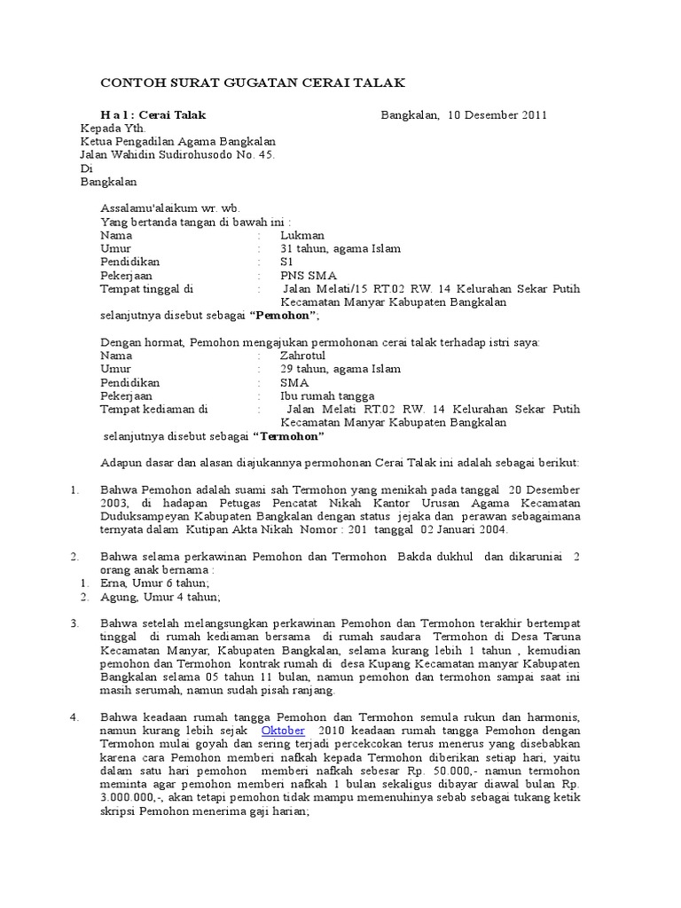 Contoh Surat Cerai Talak - Gudang Surat